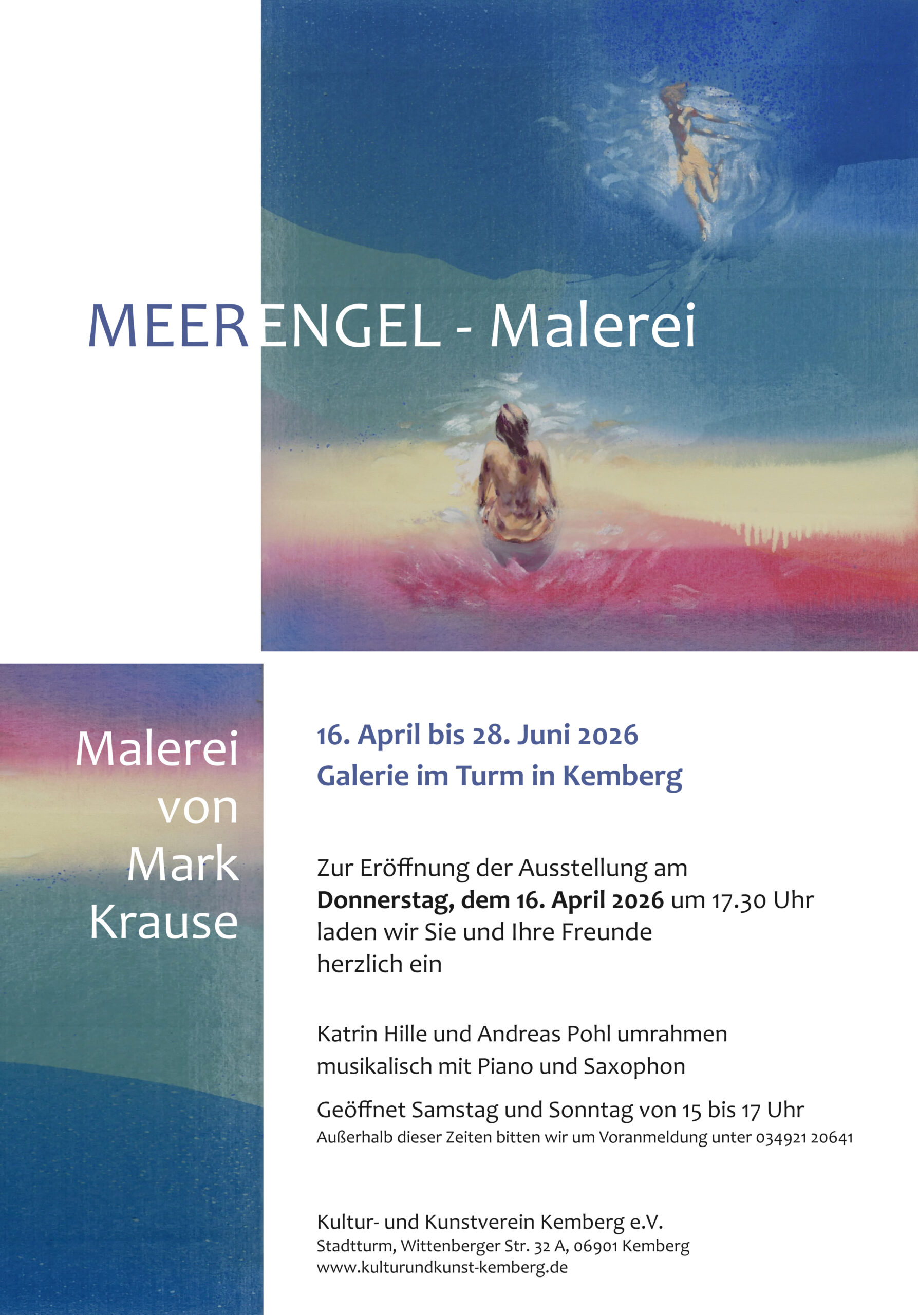 Anmeldungen auch außerhalb dieser Öffnungszeiten sind unter e-Mail: kontakt@kulturundkunst-kemberg.de oder Telefon: 034921 20920 möglich.